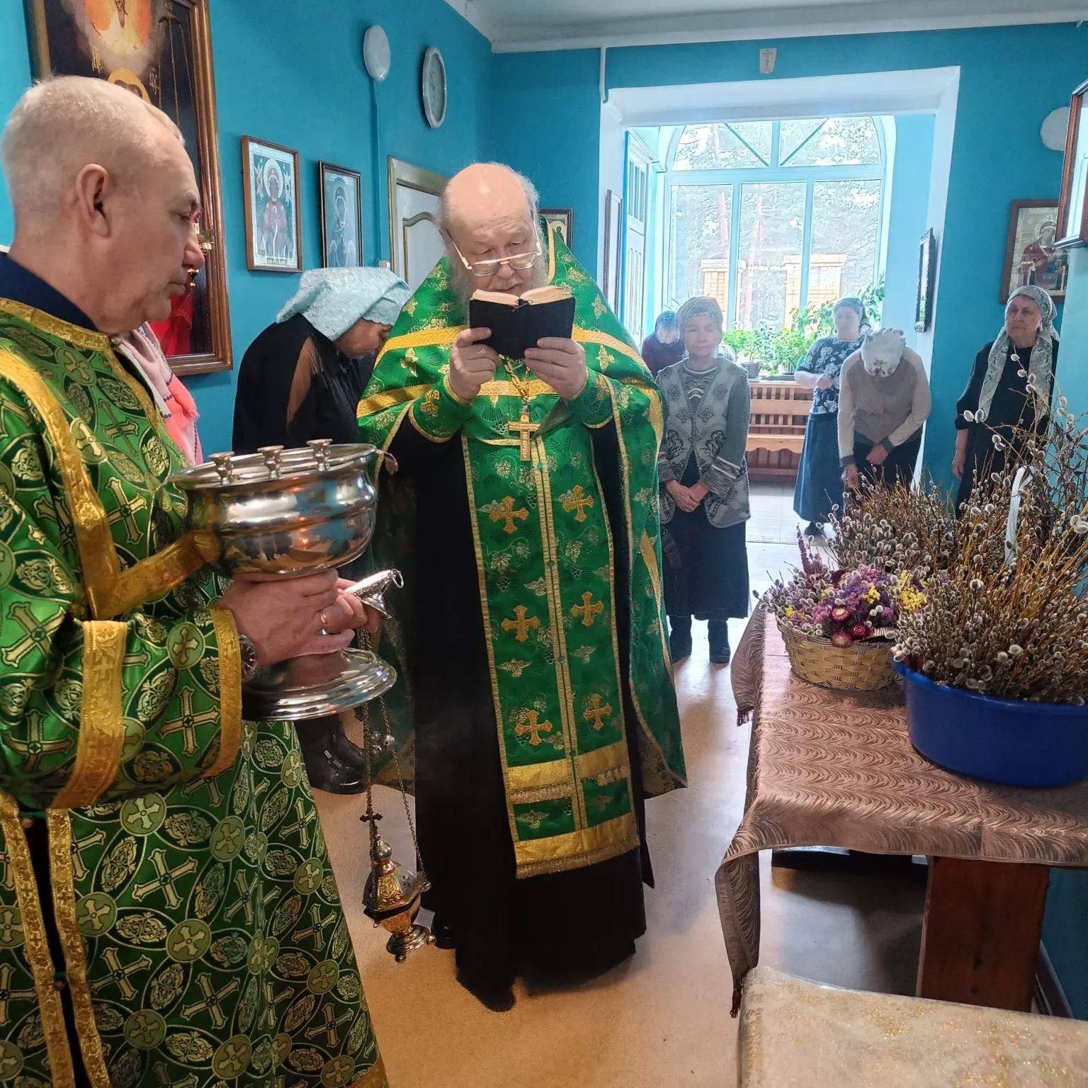 В день праздника - Вход Господень в Иерусалим, иеромонах Алипий совершил Божественную литургию святителя Иоанна Златоуста, освятил вербы.