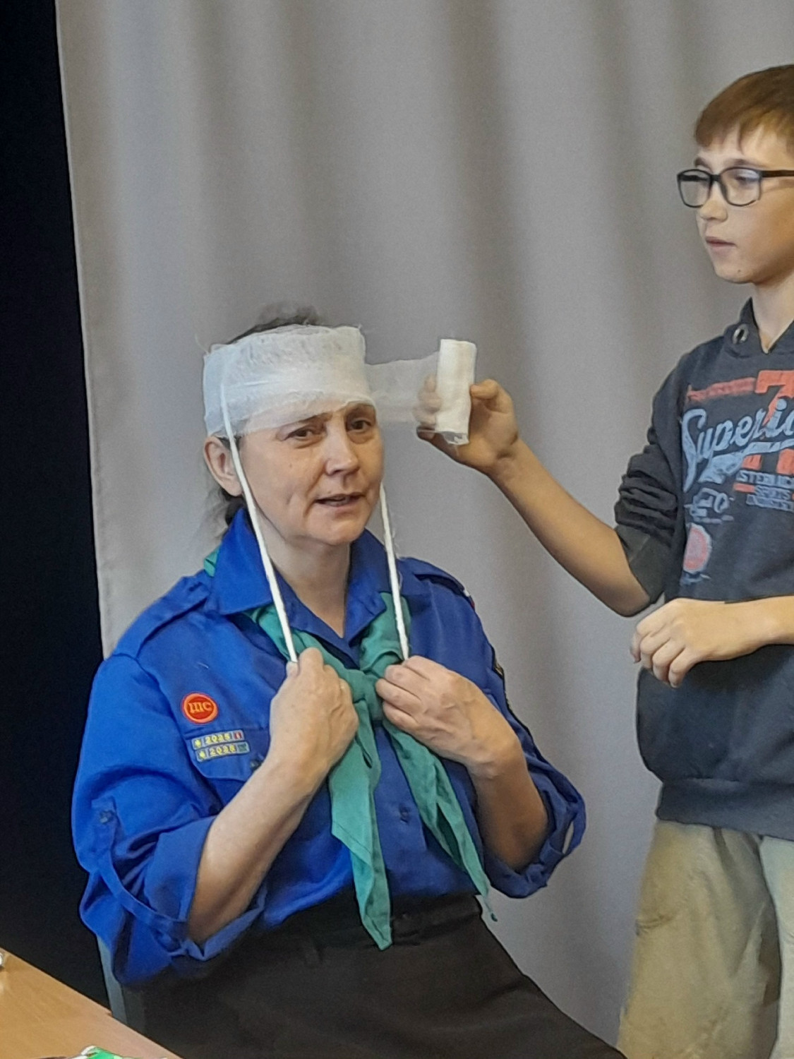 Джамиля Джалиловна рассказала нам о том, как правильно делать перевязки и приняла зачёт по первой помощи при ранении головы. Ей в этом помогали старшие следопыты.